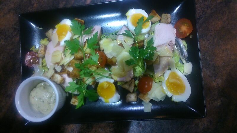 d'un large choix d'encas salés (Salades composées, Tartare de bœuf charolais coupé au couteau, Tartare végétarien, Quiche de saison,planche de charcuterie ou fromage, Potage etc...)